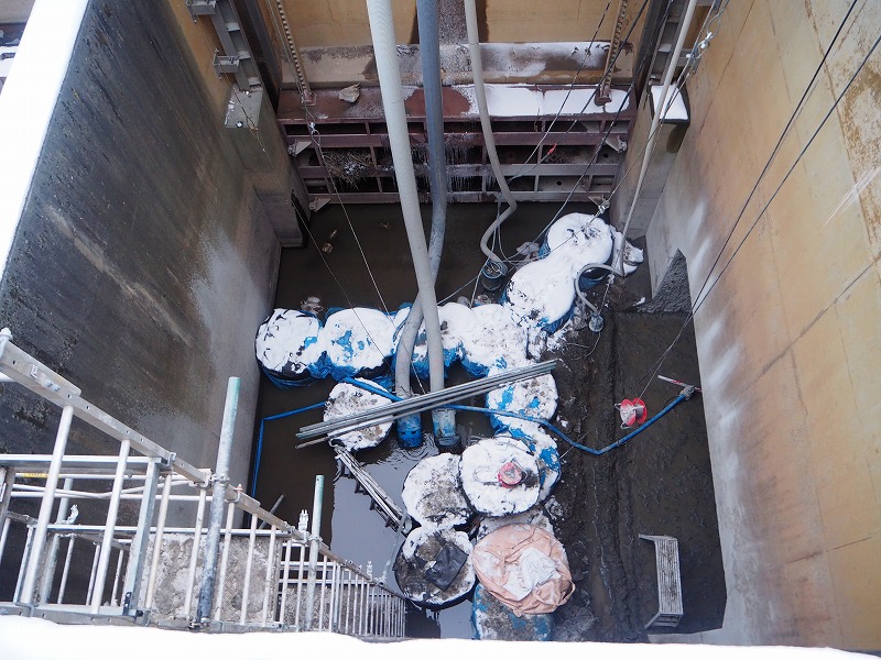 続いては、千歳川南6号樋門撤去の現場です。本工事は、千歳川南6号排水機場の樋門撤去に伴う築堤の開削および盛土工事です。昨年新たに設置された樋門と水槽の接続部を開口した後、築堤の開削、旧樋門の撤去、築堤盛土を行います。水槽の高さは10メートルにも及び、作業を進めるにはクレーンが必須です。また、現場近くには農業用水の取水口があり、強い流水が流れ込むため、水流管理が重要です。そのため、7台ものポンプを使用して水替えを行い、新しい樋門の開口作業が進められました。取材当日もポンプが稼働しており、さらにバックホウが5~6台同時に作業を行っていたため、非常に迫力のある現場でした。