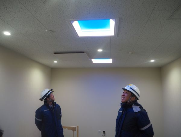 札幌では雪の日が続いており、かなり積雪がありましたが、室蘭市は雪が少なく、現場担当者の西本所長は、除雪のない現場は初めてだとお話されていました。事務所内の会議室には、天窓のような見た目の青空照明が設置され、時間帯によって照明の色も変わるとのことでした。