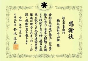 令和2年度 感謝状(一般土木工事部門優秀業者)