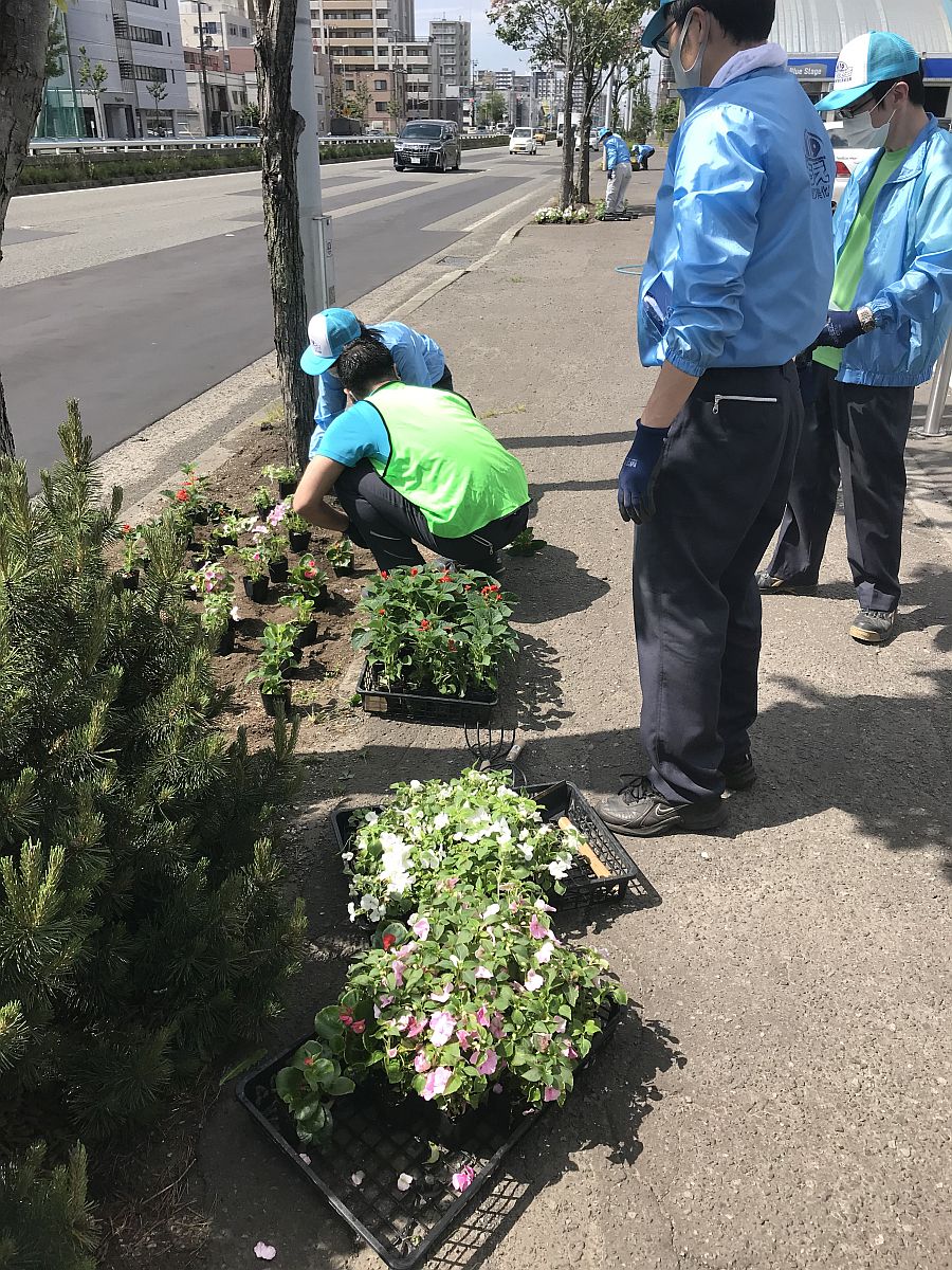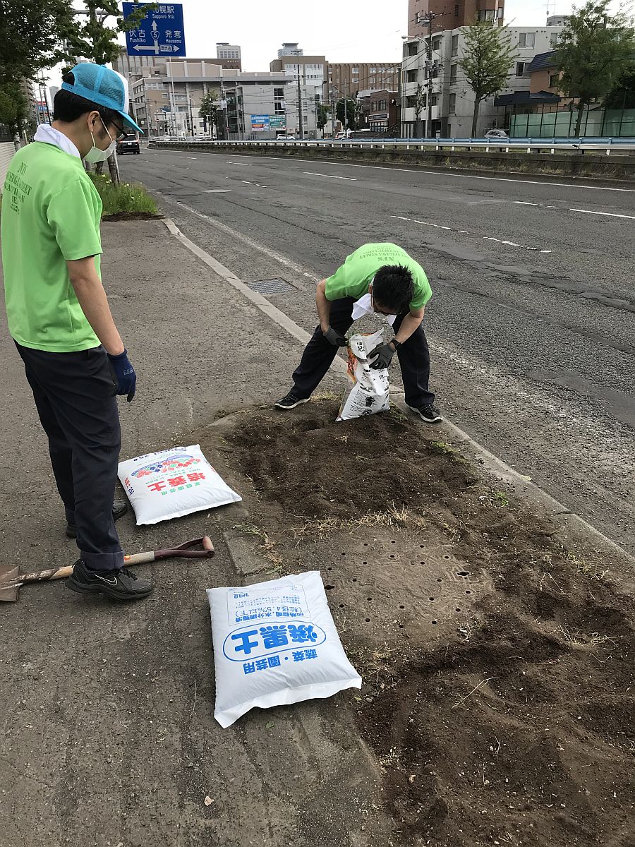 今回は北海道の緊急事態宣言の解除を待っての活動の開始となりましたが、新型コロナウイルス感染拡大防止の為班ごとに時間を分けて花植えを行いました。