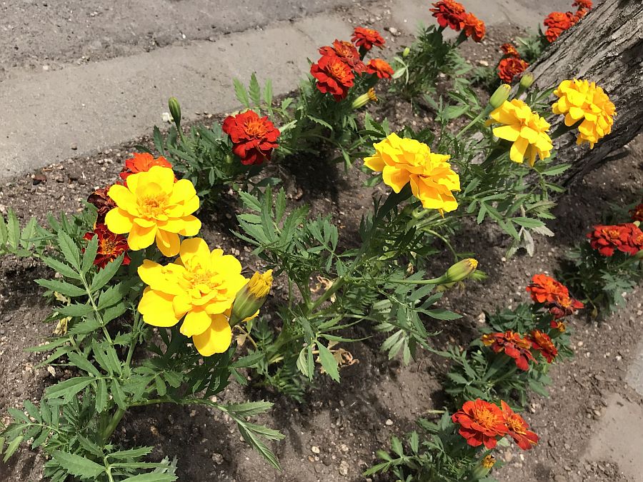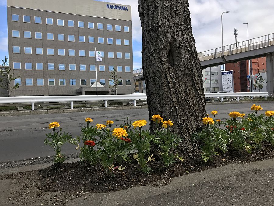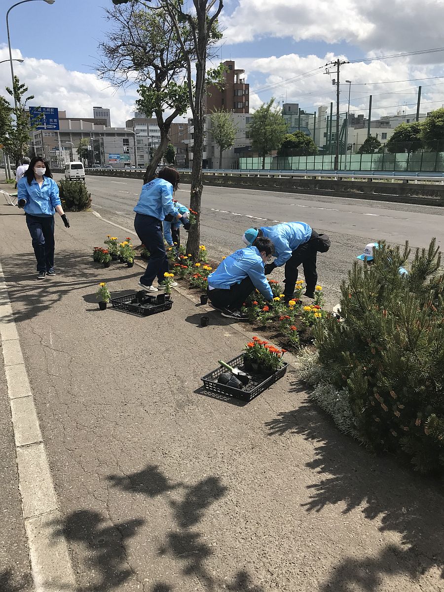 2020-06-08令和2年6月5日、「N19ともえ会 創成川通り美化推進活動」を実施しました。この活動は北海道開発局のボランティア・サポート・プログラムとして平成19年から継続しており、今年で14年目になります。今年もN19ともえ会の各社社員で、創成川通りの北18条~北20条間の23か所の植樹枡の清掃と花植えを行い、マリーゴールドなど約800株を植えました。