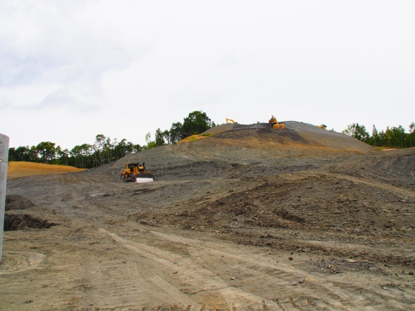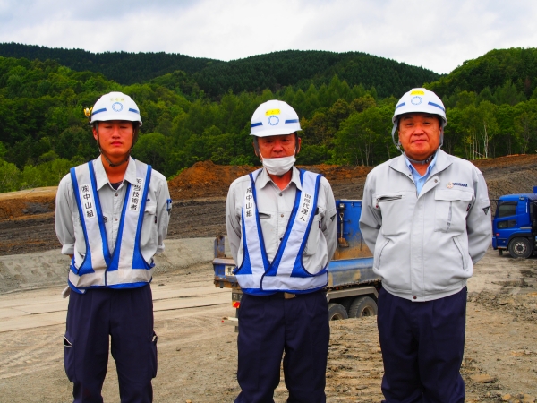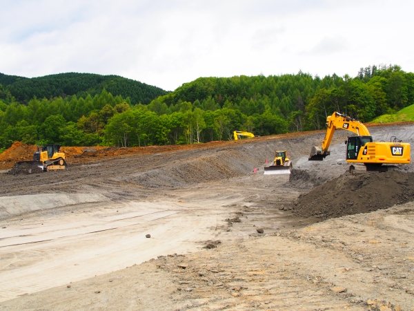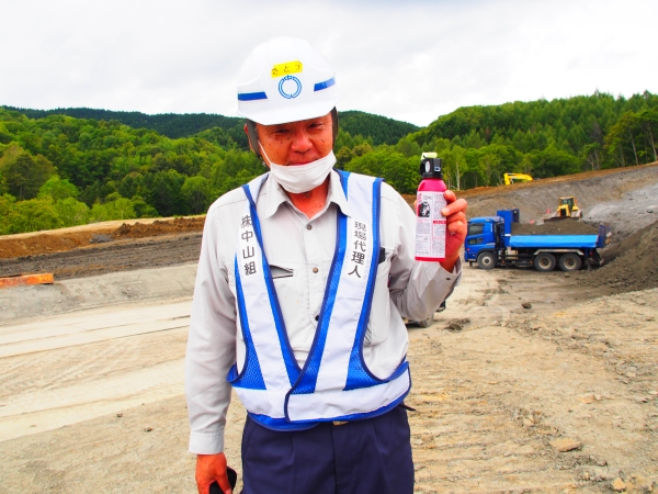 次に向かったのは、「新十津川最終処分場」です。こちらは廃棄物を安全な状態で埋め立てる安定型の処分場で、現場事務所でお話をお聞きした後、佐藤所長の車で現場まで連れて行っていただきました。山道をしばらく上る途中にも作業箇所が点在し、残土を運搬するトラックが頻繁に行き来していることからも大規模な土木工事であることが窺えましたが、実際に現場に到着すると想像よりもはるかに広大な土地面積が伐開され、ブルドーザーやメンクなど多くの重機が絶えず稼働しており、中山社長もこんなにたくさんの重機を一度に見ることは中々ないとお話されていました。幅の狭い場所や急な斜面を力強く前後進するさまはとても迫力がありましたが、安全管理の面で一瞬たりとも気を抜けない緊張感もひしひしと伝わってきました。施工場所が山奥ということもあり熊も出没するそうで、携帯している熊撃退用スプレーの使い方も教えていただきました。様々な危険の伴う大掛かりな工事ですが、最後まで事故なく無事に竣工を迎えられるよう願っています。お忙しい中、時間を割いて対応していただきありがとうございました。