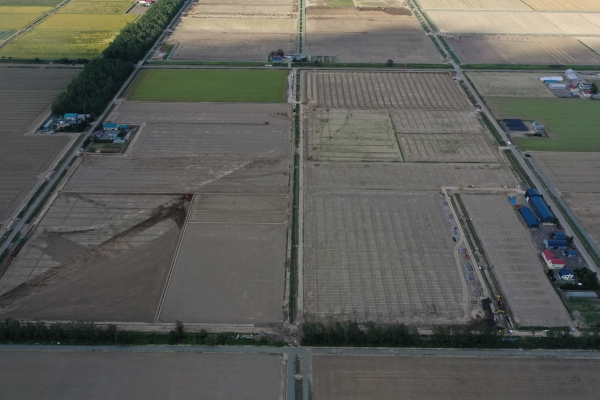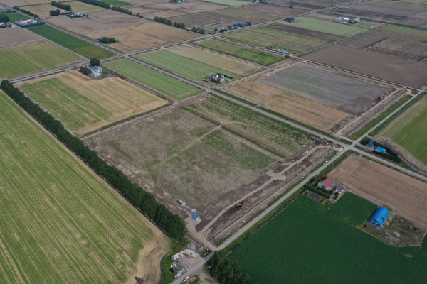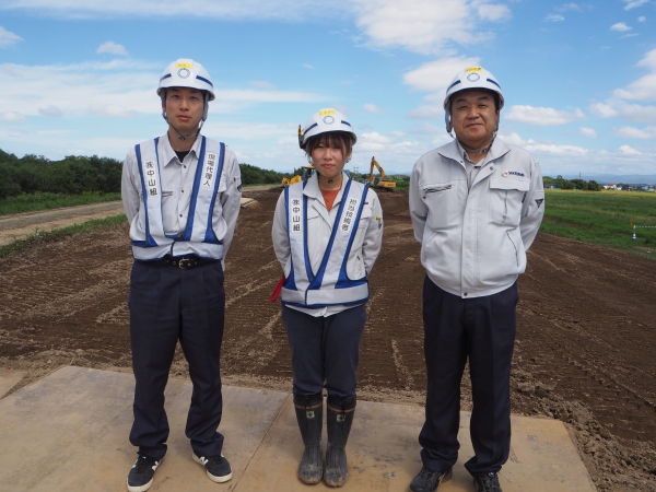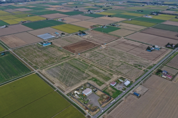 「長沼町新光東ほ場」の現場は、一つ前に訪問した「新光西ほ場」のすぐ近くにあり、遠くに現場事務所がお互い視認できるほどでした。