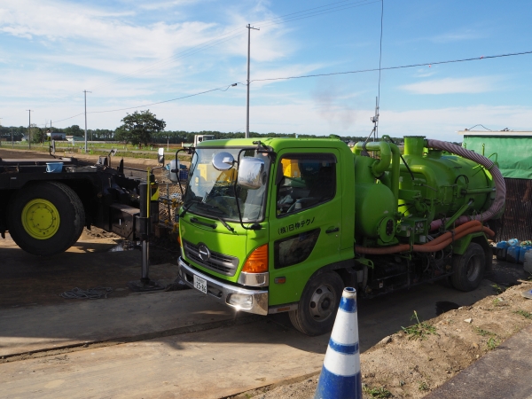 五番目に訪問した現場は「南長沼21工区ほ場」です。こちらでは、道路と河川の下に農業用用水の管を通すために、ほ場整備ではあまり見られない推進工が行われていました。訪問時には、その最中の様子を見ることができました。又、ほ場内に農業用用水の管を埋設していくにあたり、施工箇所の地下水位が高く施工が困難な為、ウェルポイント工法により地下水位を下げて施工を行っているとのことでした。当日は見ることができませんでしたが、整地工や暗渠工なども同時に進められているそうです。