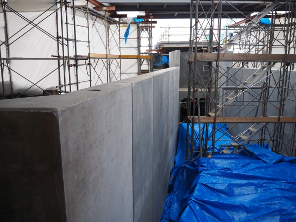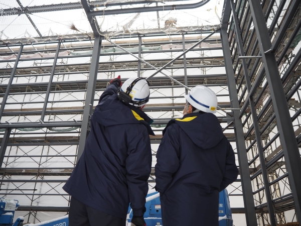 続いて訪問したのは、「SUMCOUT棟増築」の現場です。株式会社SUMCOの工場で必要となる地下水を、ろ過するためのろ過機を置く施設を施工しています。こちらの工場では特許技術なども保有していることから、入り口では守衛の方が管理されており、セキュリティ対策がしっかりとなされていました。施工物は、その中に設置するろ過機のタンクが大きいためとても背の高いものとなっています。訪問時は、屋根の施工が行われており、その様子を下から見ることができました。今後高所での作業がより増えてくると思いますが、無事に竣工を迎えられることを願っています。