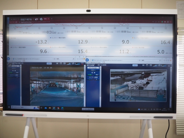続いては「漁太南22号樋門改築」の現場です。ひとつ前に訪れた工事同様に、樋門の改築工事です。こちらでは、現場で型枠を組みコンクリートを流し込むという、現場打ちコンクリートで施工されています。訪問時の現場の様子は、AIボードというモニターを通して見ながらお話を聞かせていただきました。人員不足で現場が思ったように動かず、進捗について苦労している部分もある様ですが、無事故無災害で5月の竣工を迎えることを願います。