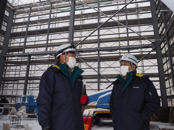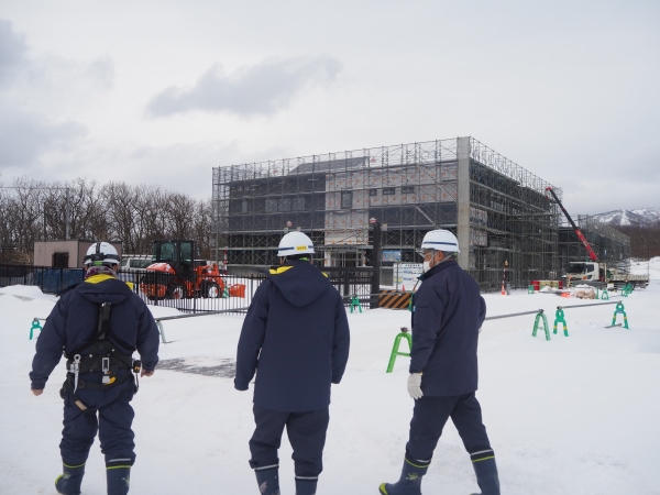 最後に訪れたのは「北海電工室蘭社屋改築」の現場です。1Fは高所作業車などの車庫となり、2Fが事務所になります。事務所には50人ほどの方が常駐されるようです。建物は2階建てですが、車庫は重機の入る仕様のため建物は想像以上に大きく、とても迫力がありました。今後は内装の工事を進め、3月に入ると外構工事といったように計画的に管理されています。現場は、スキー場が近くにあるほど山の上に位置するため、風が強く雪も多く降りますが、なによりも体調に留意して無事に竣工を迎えていただきたいです。