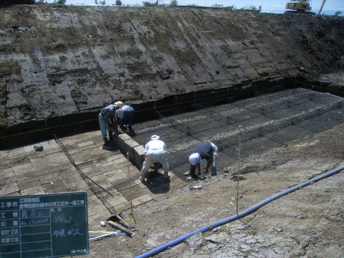 こちらの工区は440mの水路を改修する工事で、既存の水路の底には古いブロックが敷き詰めてありました。廃棄するとなると費用もかかる上に、「盤膨れ(ばんぶくれ)」という地盤が盛り上がる現象が起きるため、一度取り払ったブロックを選別・綺麗に洗浄し、布団かごに入れて水路の底に戻す他、水路の曲線部に護岸用として再設置するのだそうです。驚いたのは、再利用するブロックの個数がなんと8万個もあり、洗浄及び設置をすべて作業員が手で行ったそうです。かなりご苦労されたのだと思います。本当にお疲れ様です。