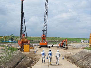 - 遊水地の周囲堤盛土の基礎地盤の改良を行っている状況です。 先端にスクリューのある攪拌用機械で、現地盤にスクリューからセメントを噴射しながら回転貫入し土とセメントを攪拌することで、土中に円柱状の改良体を作成する工法です。 径が1.6mの円柱状の改良体を2.6mと2.0mの間隔で施工しその上に周囲堤盛土を行います。今回は地盤改良だけの設計なので次年度に周囲堤盛土の工事が発注されます。