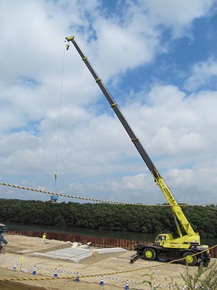 - 取水口部の護岸コンクリートを ラフタークレーンで打設作業中です。