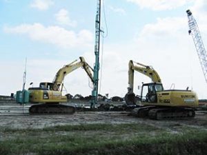 遊水地の周囲堤盛土の基礎地盤の改良を行っている状況です。 先端にスクリューのある攪拌用機械で、現地盤にスクリューからセメントを噴射しながら回転貫入し土とセメントを攪拌することで、土中に円柱状の改良体を作成する工法です。 径が1.6mの円柱状の改良体を2.6mと2.0mの間隔で施工しその上に周囲堤盛土を行います。今回は地盤改良だけの設計なので次年度に周囲堤盛土の工事が発注されます。