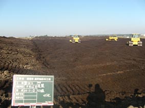 この現場は千歳川河川整備計画に基づき、晩翠遊水地内の粘性土と購入した砂質土を土砂混合攪拌し、周囲堤の盛土を行う工事です。
