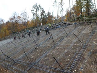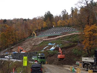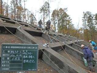 主な工事内容は、道道135号美唄富良野線の未開通区間で既に地滑りが発生している法面を、法枠フレーム(50㎝×50㎝)と抑止アンカー(平均長さ15m)で抑えるという工事で、資材等を法面に荷上げするために仮設モノレールを使用していました。