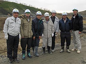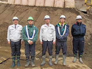 - 左から、中山社長、柏原さん(環境美唄支店長)、舘崎さん、高橋さん(環境社長)、増井さん(増友土木)、志田さん、水間さん(環境)