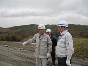 この現場は当社の関連会社の環境エンジニアリング(株)の産業廃棄物処分場の現場になります。今回見せていただいたのは、現在産業廃棄物の処分場として使用されている施設と、現在使用している施設への廃棄物の埋立てが終了した後に、産業廃棄物処分場として使用するため現在施工中の新しい施設です。産業廃棄物管理型処分場の施設及び施工中の状況等について環境エンジニアリング(株)の高橋社長に説明していただきました。