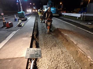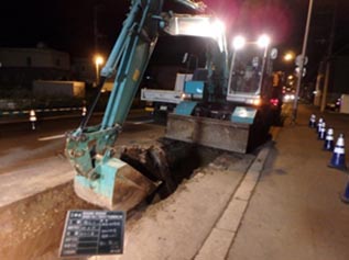 ここの現場は、札幌市厚別西地区の下水道管設置の現場です。交通量の多い幹線道路に面しているため工事をするのもなかなか大変らしく、道路を通行止めにする事が出来ないことから片側交互通行の交通規制で工事を行っていますが、作業をしているすぐ横をスピードを出して走行する車両も多いことから、とても危険な現場に思えました。また、工程の都合で殆どが夜間作業による施工で、近隣の住民の皆さんにご迷惑をお掛けしてしまうことも有り、その対応には気を遣うとのことでした。