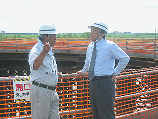 この現場は、旧美唄河川保護の現場からすぐの新篠津村中心部でした。ただ工事箇所が広範囲で、小田桐君、大村君を探すのに大変手間取りました。全体的な話は忙しくて聞けませんでしたが、JVメンバーとして災害には特に気をつけて施工してください。