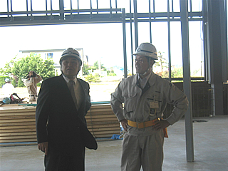 松本所長と金田一君から説明を受け、JVの泰進建設の方と一緒に写真を撮ってもらいました。建築現場は、高所作業が多いので災害には特に気をつけて行うようにお願いをしてきました。