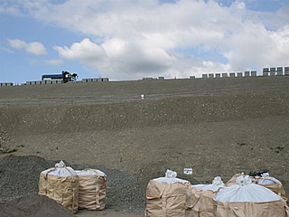 この現場は、現在供用中の最終処分場の廃棄物を減容する工事で、減容工事により1m程の沈下効果があったそうで、この工事により最終処分場の供用期間が1年半延命できるそうです。