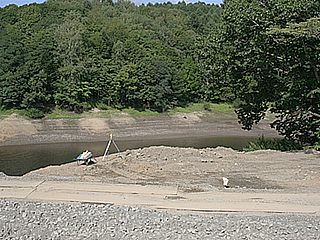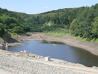 長沼暗渠排水の現場から少し移動した所に、栗山防災ダムの現場があります。この周辺には10件ほどの農家があり、このダムが貴重な水源となっており、施工中もダム内に溜まった水を使いながら作物を育てているとのことでした。伺ったときは多少水位が下がった状態とのことでした。