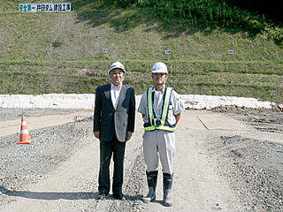 平成20年8月21日、中山社長の現場訪問が行われました。「木の繊維新築」、「長沼ほ場」、「千歳道央注水」、「長沼暗渠排水」、「栗山防災ダム」、「栗山処分場」の土木5現場・建築1現場を訪問され、現場取材として同行させていただきました。
