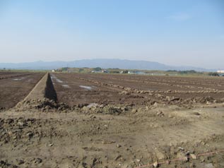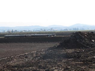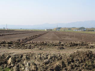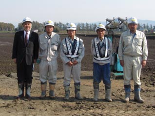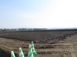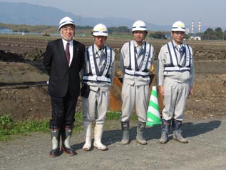 ちょうど客土の真っ最中の現場で渡邊君から説明を受け、一緒に仕事をしている斎藤、鉢呂両君と写真を撮りました。他の二か所は暗渠工事中との事です。工期が12月末までになっていますが、降雪前にはメドをつけるべく頑張っているそうです。やはり、安全は元より、健康管理にも注意してお願いします。