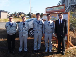 土浦にある常総国道事務所へ挨拶をしてから、田中君、藤田君に小瀧支店長と一緒に現場へ向かいました。現場までは、1時間強かかりましたが、3月11日地震の爪痕が残っている市街を通りながら、茨城県から千葉県への道のりでした。