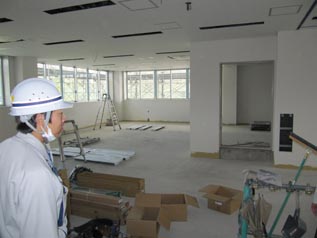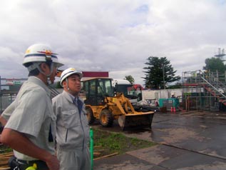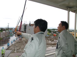 - 現場事務所で中塚主任から説明を受ける中山社長