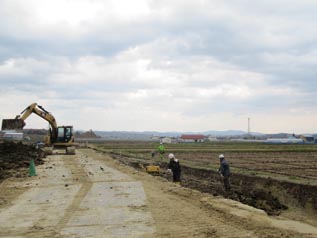こちらの工事の地区では暗渠管の上に5~25mmのビリ砂利を疎水材として利用しており、疎水材の水の浸透効果によってほ場の地下水位が下がりやすくなるそうです。水位が下がるとそれまで農業機械が入れなかった田んぼが乾き、農機具による作業が効率よく出来るようになるなどの利点があります。ほ場によっては施工前に人力による排水を行わなければいけないほどの湿田もあり、施工効率の向上を図りながらも、ほ場を痛めないように注意して進めなければならない点が苦労したそうです。