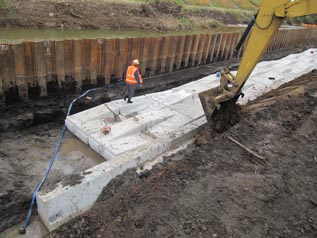 この日は矢板を打って水を抜いた河床部に根固ブロックを布設する作業が行われていました。この根固めブロックは3tもの重さがあるそうです。周りは田園地帯で農家が多くこの川の水が農業用水に使われているとのことで、抜いた水は一度水槽に移してきれいな水にしてから戻すそうです。こまめに排水を行いながらの作業はとても大変そうですが、こうした積み重ねが良好な景観につながり、地域の方々に親しまれる川になるのだと思いました。これから寒さも一段と厳しい冬の季節を迎えますが、体調には十分に気を付けて頑張ってください。