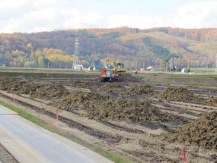 今回見せていただいたのは客土工の現場です。トラックで土を運び、ほ場へ一山ごとに土を搬入しているところでした。こうして他から性質の異なる土を混入することで土壌中に不足している養分や保水力が補われ耕地の生産性を高めることが出来るそうです。農家の方の大変な努力によることはもちろん、こういったプロセスがあって私たちのところに作物が届けられていることを改めて考えさせられました。