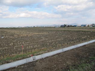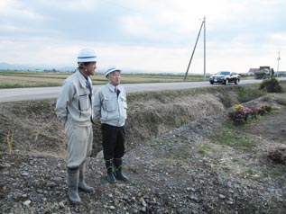 事務所で簡単な説明を受けて志田課長の車で現場へ移動しました。途中、「熊出没注意」の看板や整地・暗渠の施工個所がいくつか在り、素焼き土管と呼ばれるオレンジ色の管が布設の為たくさん配置されていました。