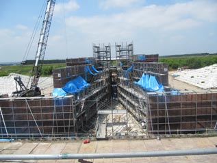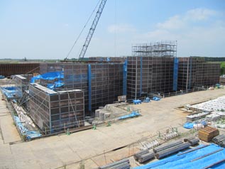 次に現場を見せて頂きました。施工中の排水門の周りには鋼矢板が打付けられていました。この地域は泥炭なので、鋼矢板沈下防止目的のために打込箇所を地盤改良しているとのことです。施工中の排水門は、養生中の生コンクリートの表面を直射日光や風から守るため屋根のようなもので覆われていました。