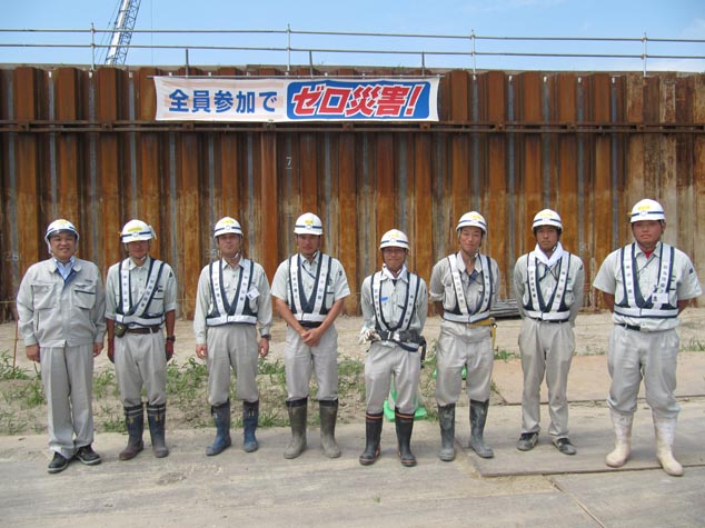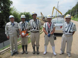 - 同じ地域で施工している晩翠遊水地排水門と晩翠南8線周囲堤の全スタッフです。 左から、中山社長、新人の小笠原君、船木さん、木嶋さん、砥石さん、金子君、池本君、前野君