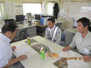 - 現場の机上説明の様子 左から、中山社長、木嶋さん、前野君、小笠原君、船木さん