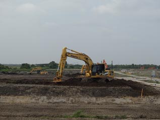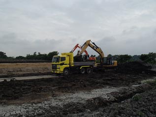 次に現場を見せて頂きました。堤防に使う土は、遊水地を掘削する際に発生した土を利用するとの事です。現場では、前年度仮置きされた発生土をダンプトラックで撹拌場所に運んでいました。また、場外から砂をダンプトラックで搬入していました。この発生土と搬入した砂を現場で攪拌する事により、堤防の盛土に使用可能な土になるそうです。