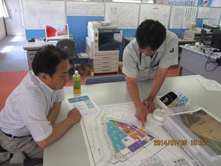 - 現場事務所での机上説明の様子 左から、中山社長、砥石さん、船木さん