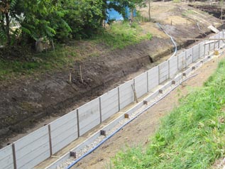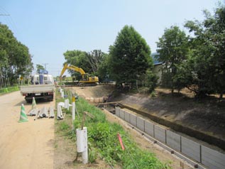 現場は道路に面しており、近隣住民の方にご協力を頂き通行止め規制を行って施工しているとの事です。現場では排水路、護岸、橋を施工中でした。橋は排水路の断面が大きくなる為、元々2本架かっていたものを取壊し、新たに2本の橋を架けるそうです。これから、護岸には、浸食防止の目的でヤシの木で出来たマットを設置、一部護岸ブロックを張るとの事です。7月に入り暑い日が続きますが、健康に注意され頑張って下さい。ご協力ありがとうございました。