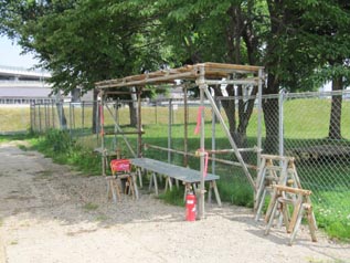 現場には、隣の公園の木をうまく利用した休憩所ができており、ちょうど良い具合に日光を遮っていました。風もよく吹く場所との事だったので、木陰に入ると涼しいとの事です。7月に入り暑い日が続きますが、健康に注意され頑張って下さい。ご協力ありがとうございました。