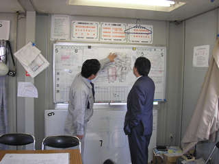 2005-10-30今回の中山社長の現場訪問 №9は、東京支店管轄の土木2ヶ所、建築3ヶ所の工事現場を目黒副支店長、吉田部長、船田部長と廻りました。