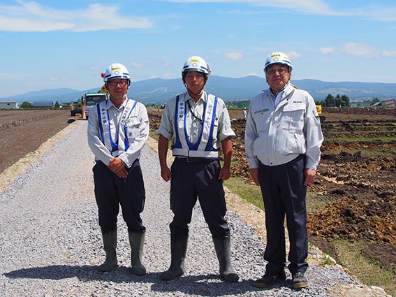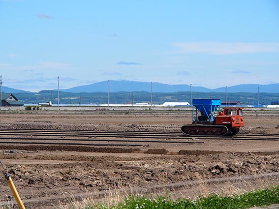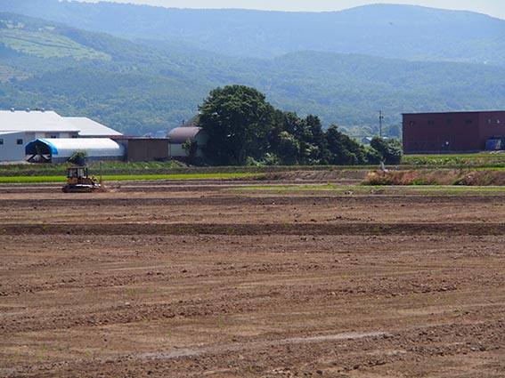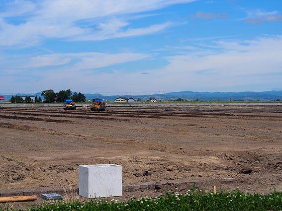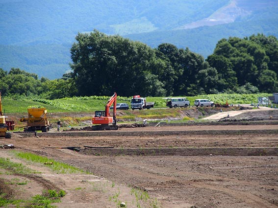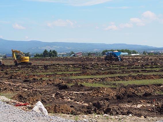 こちらの現場も農産物の生産性の向上を目的としたほ場の整備工事です。主な工種は、整地工・暗渠排水工が札幌ドーム約3個分にあたる18ha、用水路工が980m、農道工が870m、土壌改良のための客土工が36ha(札幌ドーム約7個分)で、その客土の量は26,000m3、大型ダンプ5,780台分にもなるそうです。