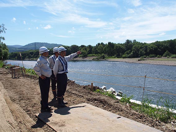 次に向かったのは深川市の「石狩川深川市災害復旧」の現場です。昨年8月に発生した台風による大雨の影響により4水系4河川で計画高水位を越えるなど北海道内では複数の河川において大きな出水となり、家屋や農地などが浸水する被害に遭いました。こちらはそのうちの石狩川水系石狩川での溢水により浸食した向陽橋下流の河岸部において、矢板護岸(281.51m)、根固めブロック設置などの護岸工事を行うことにより河岸を保護し、洪水に負けない「安全な堤防」をつくるための工事です。