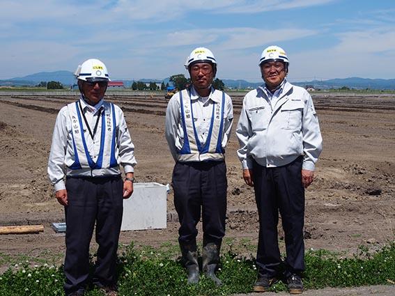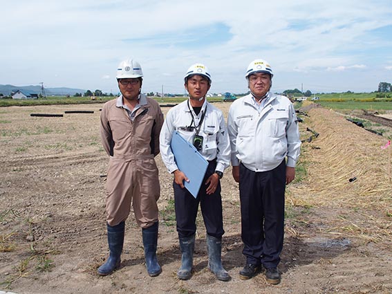 次に向かったのは「妹背牛中通西工区ほ場」の現場です。あいにく所長の小笠原さんは不在で会えませんでしたが、渡辺さんと西股さんが出迎えて下さいました。