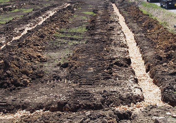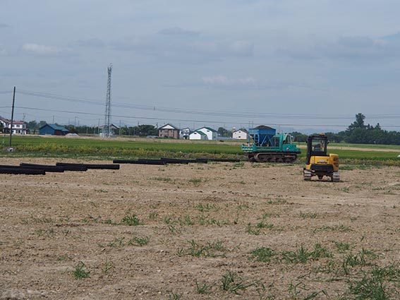 整地工はほぼ終了してパイプを土中に埋める暗渠工事へ入り、この日はインタードレーンという自動埋設機械を使用して疎水材の投入作業が行われていました。掘削溝内部に埋設した排水管の上部に疎水材を投入することで、土中の水が排水管に流入しやすくなり、水はけの良い水田になります。