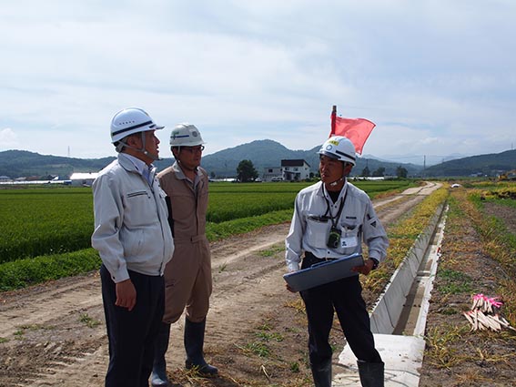 佐藤所長はほ場の現場を担当するのは初めてとのことでわからないことも多く苦労されているそうですが、受益者の方への聞き取りやコミュニケーションをしっかりとることを心がけるなど、信頼関係を大切に取り組んでいる様子が説明をしていただいたお話から伝わってきました。今後の落水・稲刈り後の施工についても、作業員等の不足が懸念される為、下請け業者との打合せを密にして工程管理を行い無事無災害にて工事完了したいとお話してくださいました。
