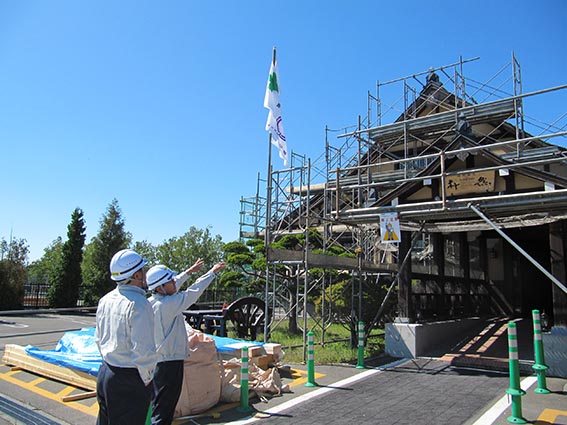 現在は天上等の木材を張り替える木工事を行っています。建物の柱に使われている木材は大きく太いものが多いため、残せるものは出来るだけ残しながら改修しているとのことでした。一部の木材を残しながらの作業は大変だと思いますが1日でも早く以前のように営業出来ることを楽しみにしています。お忙しい中丁寧に説明して頂き、ご協力ありがとうございました。