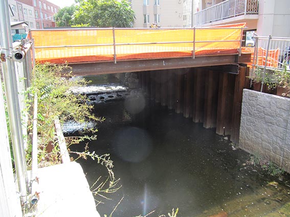 住宅街のすぐ横を流れる川での工事のためクレーンの入るところが無く構台を設置するなどして作業するため大変とのことでした。マンションなどの建物が密集しているため、作業は何かと苦労が多いとは思いますが引き続きお身体には気をつけて頑張ってください。お忙しい中分かりやすく説明して頂き、ありがとうございました。