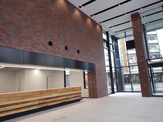 はじめに向かったのは今回唯一の建築現場でもある「滝川再開発金融棟」です。こちらは昨年に続いて2度目の訪問で以前にもご紹介させていただきましたが、北門信用金庫が本店として利用するオフィスビルを新築する建築物等整備事業の第2期工事で、昨年5月から隣接する名店ビルの解体が始まりました。前回訪問時は跡地に基礎部分を施工中でしたが、その後工事は順調に進み、完成間近のビル内を案内していただきました。