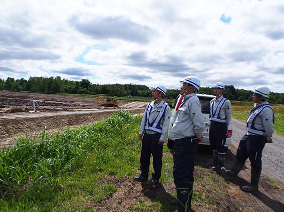 現在の状況は、5月末より先行して行っていた整地工が完了し、7月末より予定されている暗渠排水工の段取りや現地での測量を行っているそうです。メインとなる用水路工は、計1,705mを順次施工しながら揚水機場に着手しますが、例年雨天の多い秋から真冬にかけて施工するため、天候等の影響により工程の調整が難しいと予想されるとのことでした。