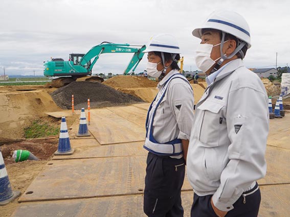 最初に訪れたのは「R2岩見沢西川南ほ場」の現場です。こちらの現場は水田地帯の区画整理の整地工、暗渠排水工のほか、用水路工、排水路工を行っている現場です。水田の落水を待ってから本格的に施工が始まったとのことで、見せていただいた施工箇所では暗渠の工事までが終わり用水路工を行っており、この日は用水路に木杭を打ち込む作業が行われていました。また、暗渠のパイプに貯水をする地下灌漑の設備の施工の様子も見ることができました。
